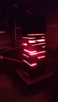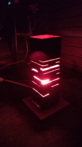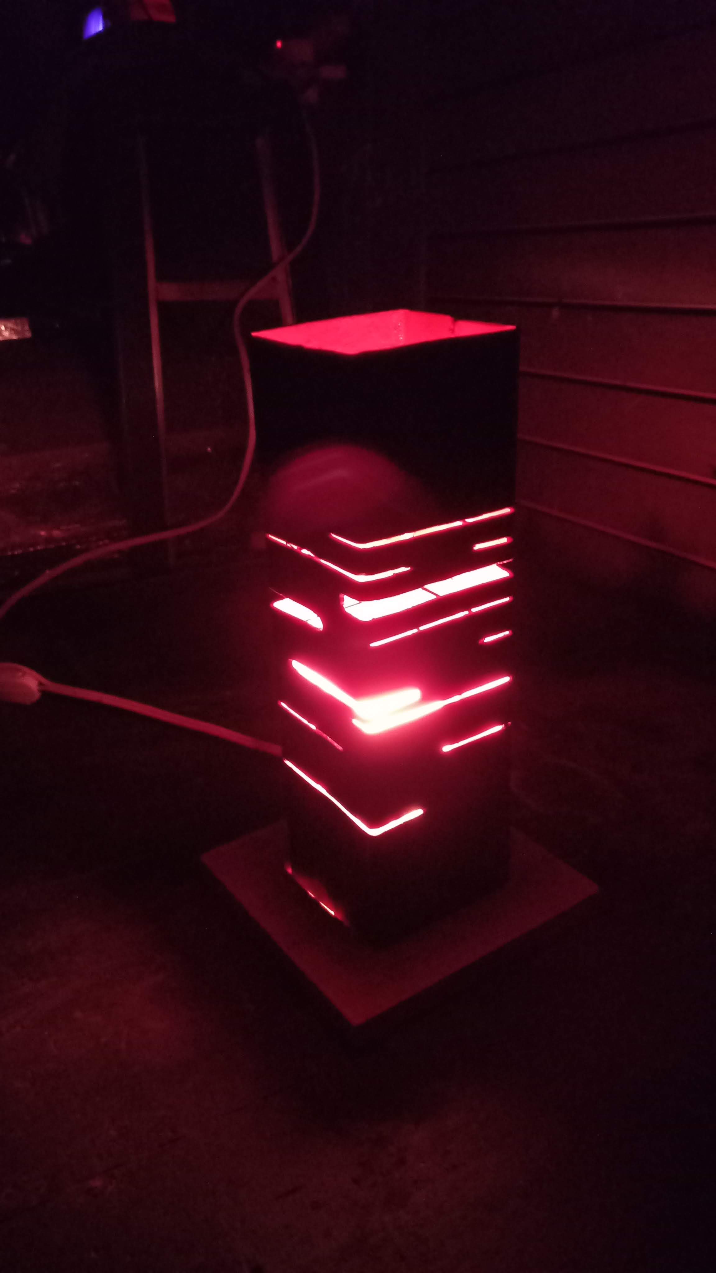 Lámpara de buro fabricada en acero industrial y recubierta con tratamiento anticorrosivo, base de madera e iluminación interna.