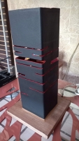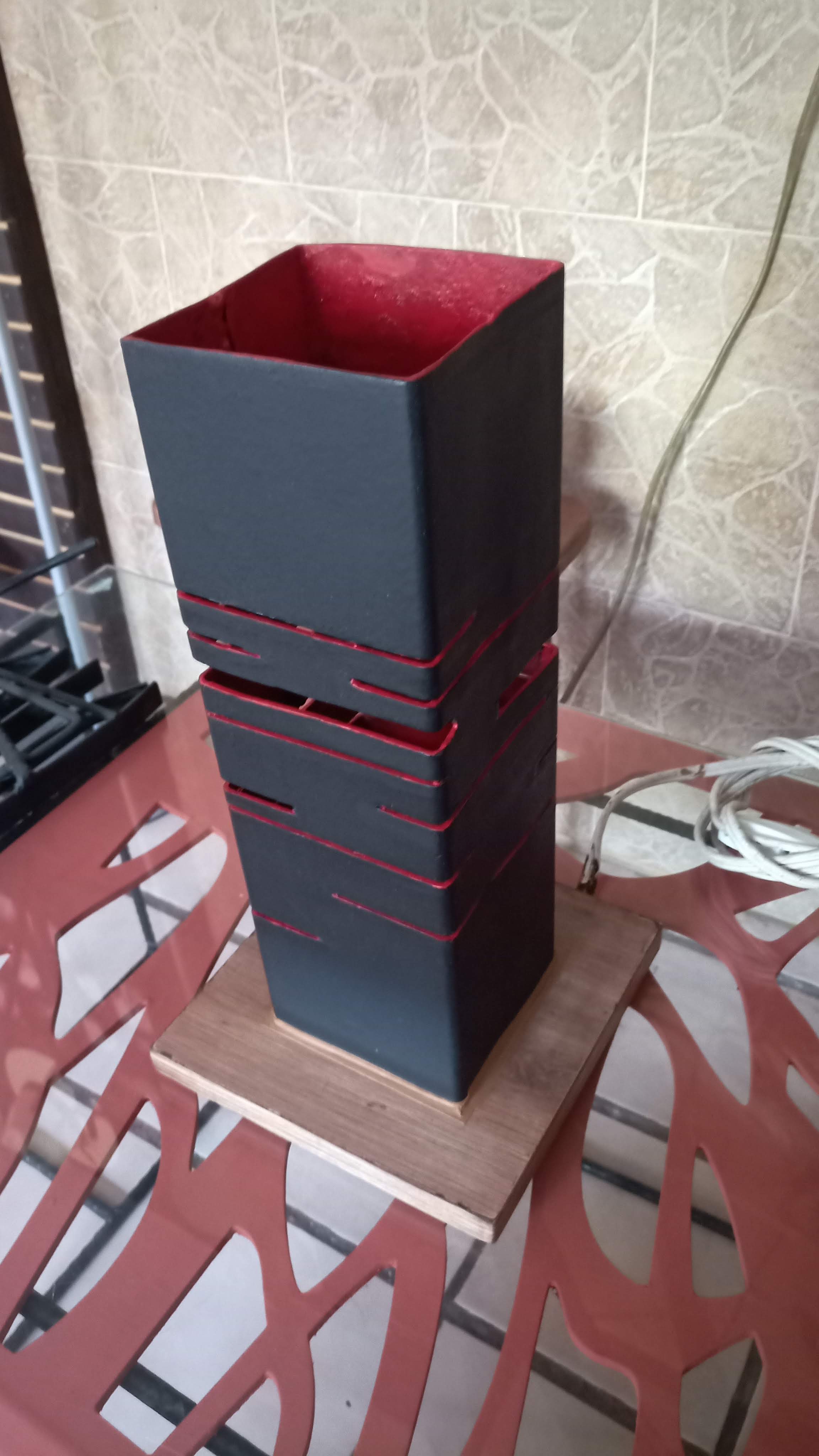 Diseño minimalista, lámpara decorativa con aplicaciones de madera, disponible en combinación negro mate exterior y rojo caramelo interior (otros colores o tonos disponibles solo bajo pedido).
