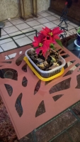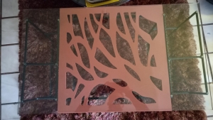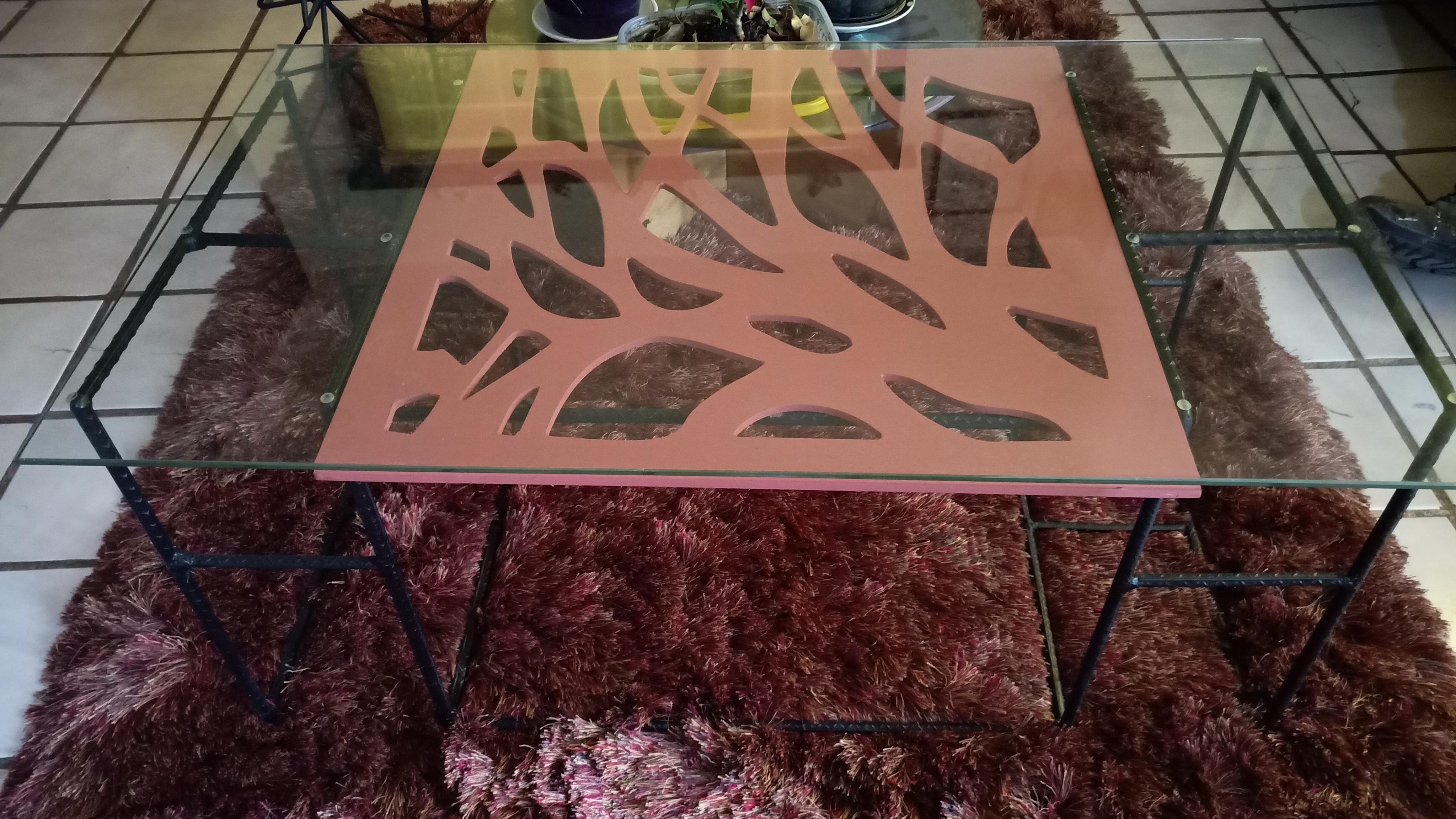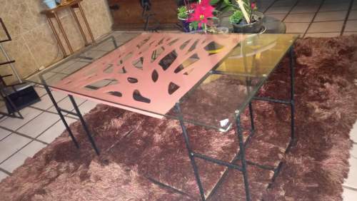 Mesa fabricada en acero industrial recubierto con tratamiento anticorrosivo, cubierta de cristal templado y adorno intermedio en macocel.