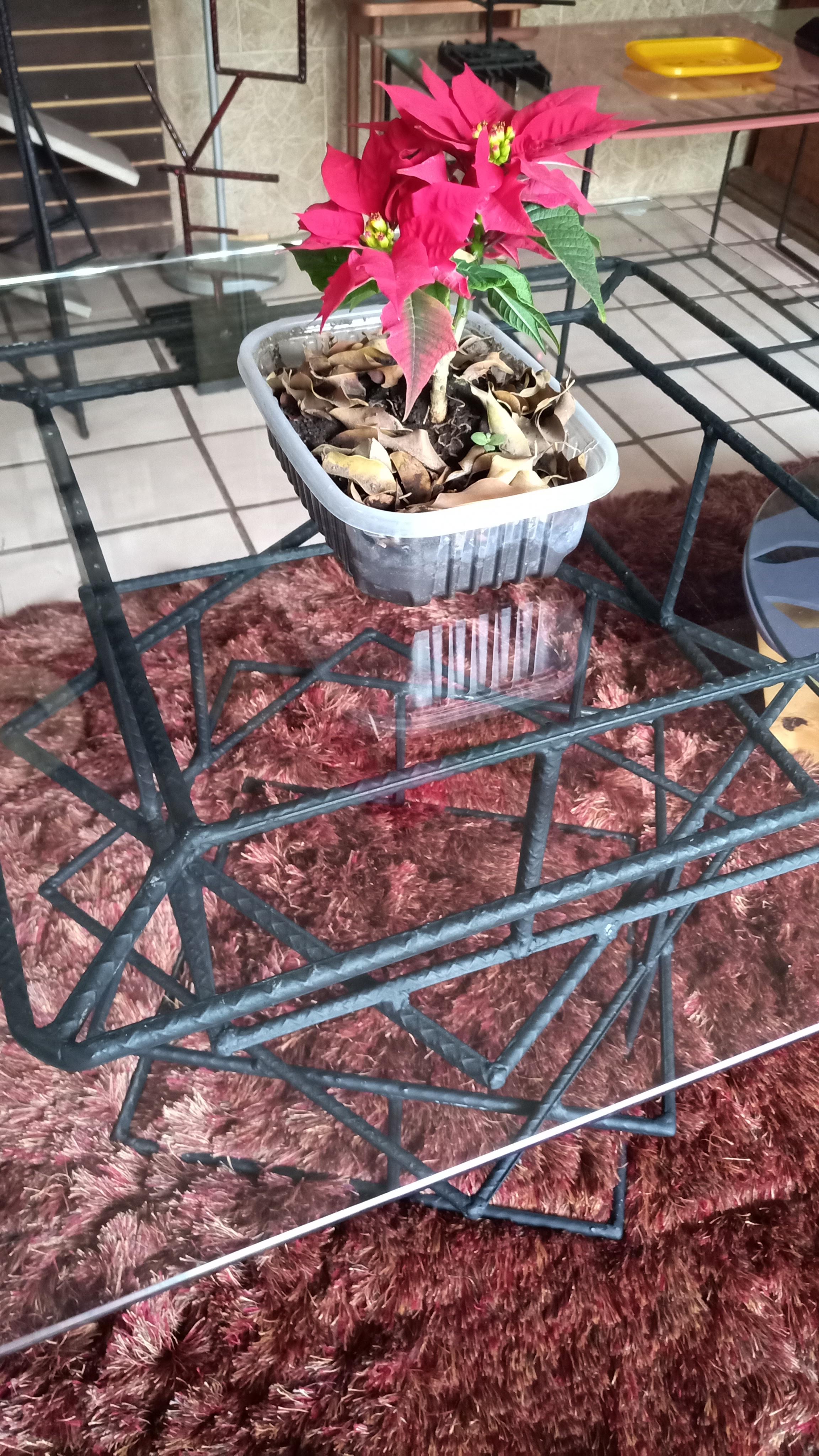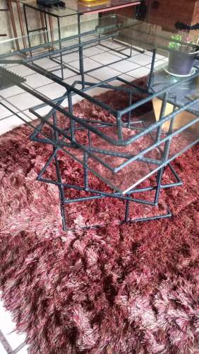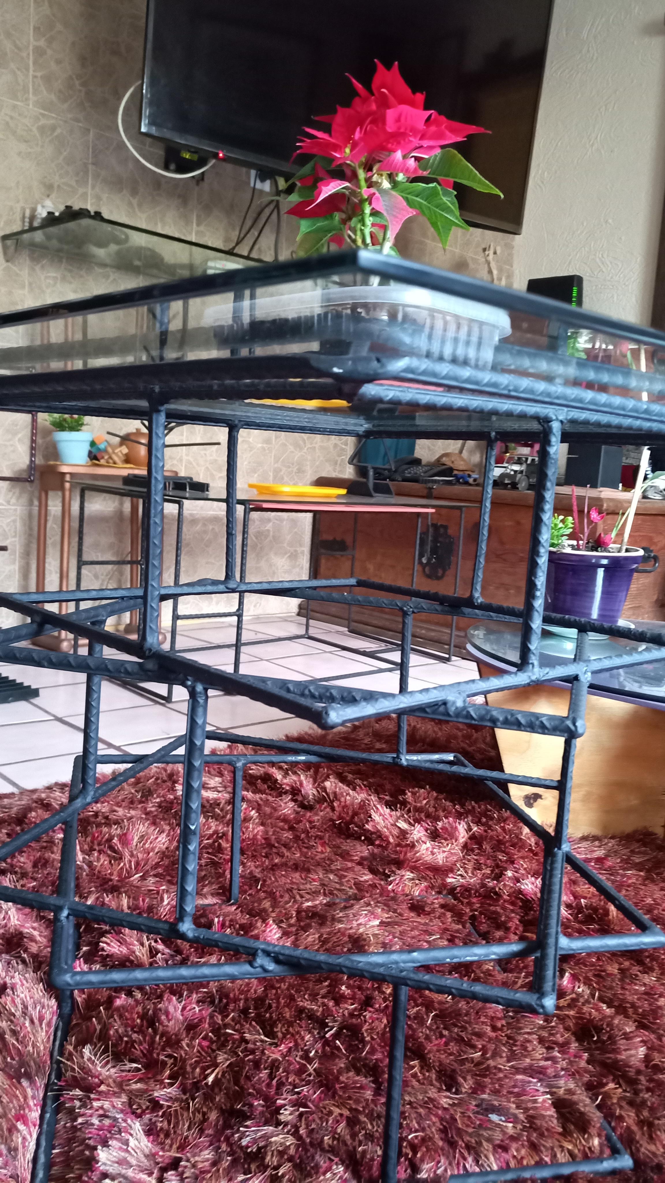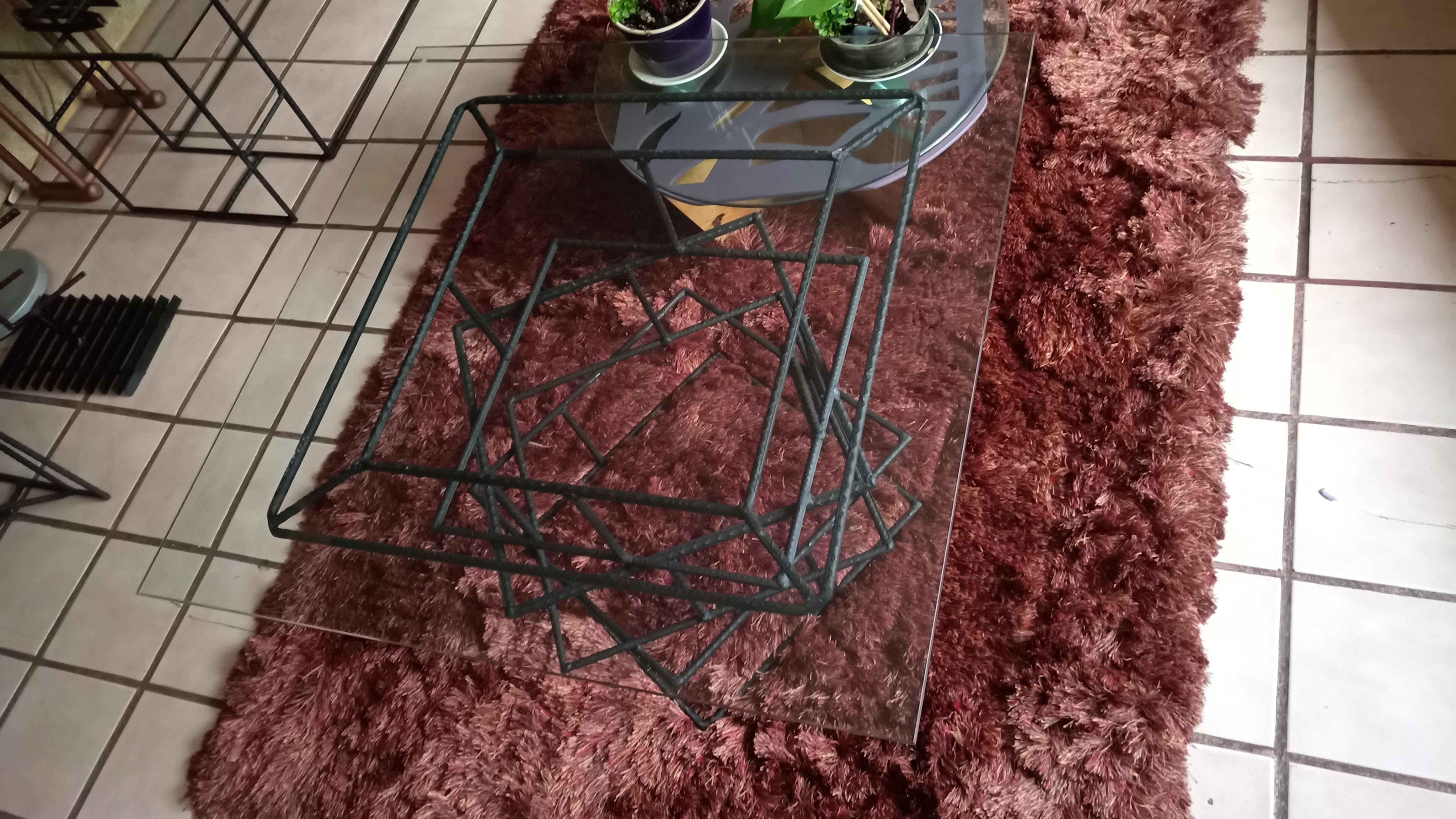 Mesa de centro fabricada en acero industrial recubierta con tratamiento anticorrosivo, superficie de cristal templado claro.